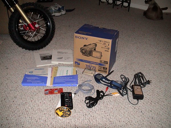camera w/lens cap, box, manuels, software, usb cable, charger, A/V tv cable, strap, 2-hour battery, 60min minidv tape, 8mb memory stick, remote
