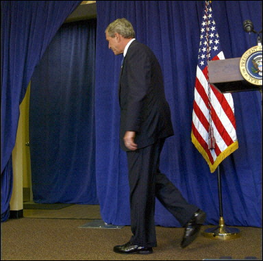 US President George W. Bush (news - web sites) walks away from a briefing with the media after being asked about Enron and the reported indictment of former CEO Kenneth Lay. President Bush (news - web sites) no longer maintains contact with Lay, White House spokesman Scott McClellan said.(AFP)