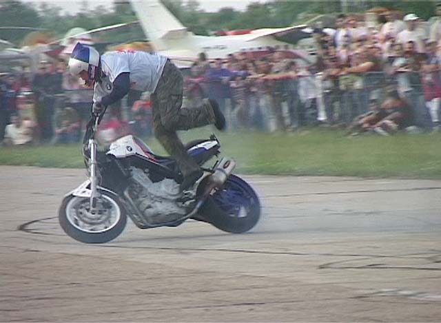 How did that dude do that lateral burn out one foot on the fork one on the shifter side did he have pegs on the forks?
