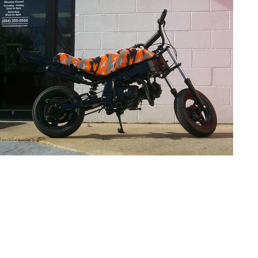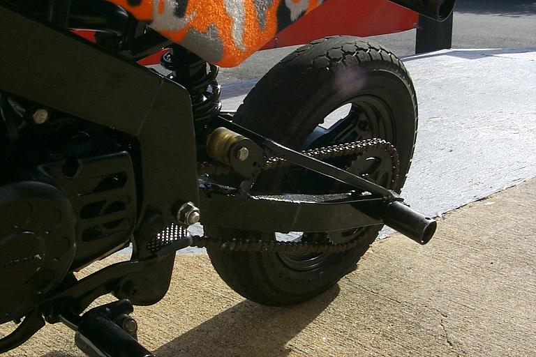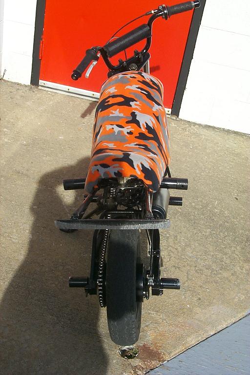 i didnt have a fuel tank for this bike so i have a lawnmower tank under tha ducati monster rear hugger thats rivited to the seat unit and then cover to look like one piece. ((a new tank for this bike is insane))the swingarms on these bikes **** this one was bent so straightn it out and braced it.i'm loving this bike not as easy to whoolie as my sons xr but it does the job,, ive learned so much in the last week or so about rear brake control then my whole time on my big bikes:YEAH