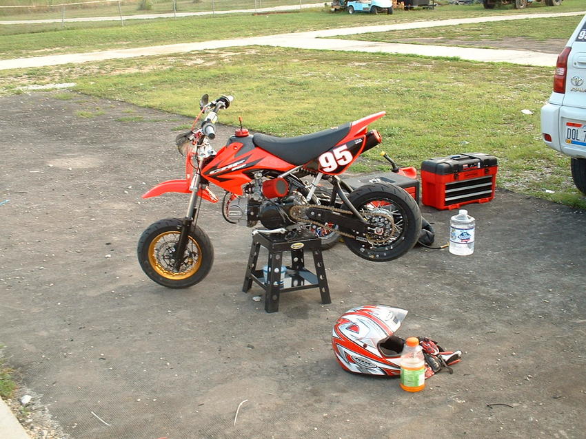 Oh and motor wise I am running a Prc 117cc stroker. Lightend crank and flywheel, port and polished head. Tb econo manaul clutch with billet basket, hd clutch plates and springs. Kitaco hd oil pump.Stock tranny. Mikuni 26mm round slide carb with uni air filter. Ignition- nology wire, stock coil, kitaco rev box. Gearing is16/34. Bike will wheelie in any gear and tops out with this gearing just over 60. Oh yeah and a classic ultima pipe.