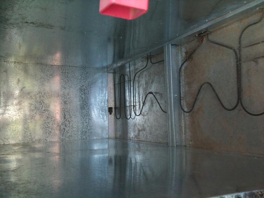 made my oven from 26gauge sheet metal and 2x4 metal studs and lots of rivets. The insulation i used is a 2000 degree rated insulation. the walls are 2 inches thick. i used 4 elements from some old ovens i found on craigslist. my oven is a 240. the smaller ovens i have a 110.