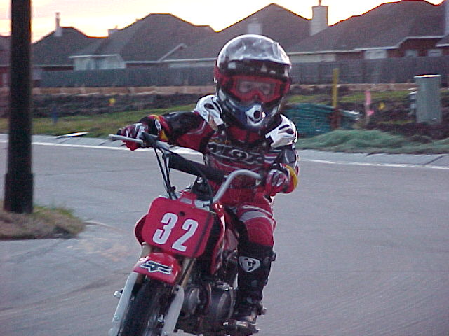 I had to turn the throttle stop almost all the way down. He's got a heavy throttle hand like his mom's foot. He did pretty goo except for running into the side of a truck when he panicked turning.