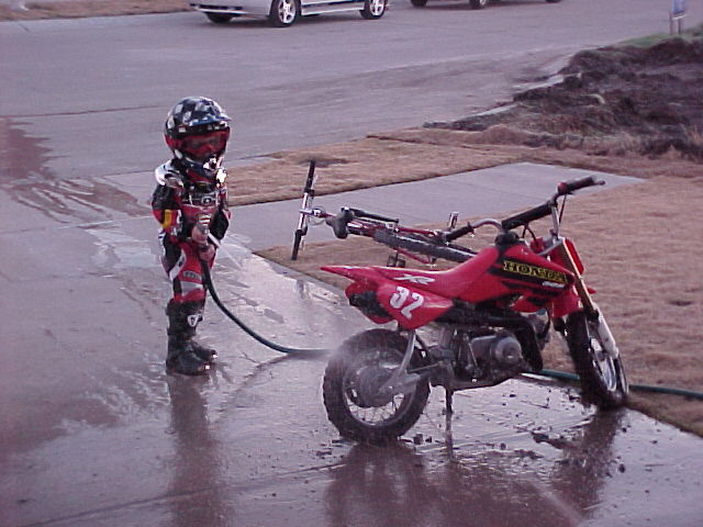 i love that second picture,,,, hes just all geared up head to toe,, to wash the bike down,,, LOL.. kids!