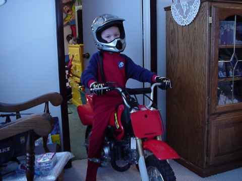Here's my boy Christmas morning. We were riding in the house with me on the back and he cranked the gas wide open and we looped his first wheelie. Still haven't got to ride outside yet because of the weather.