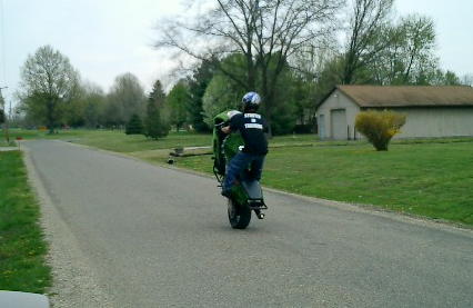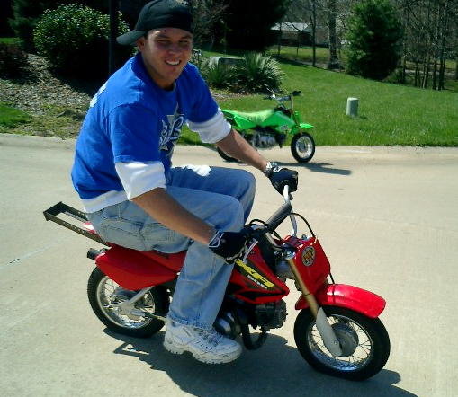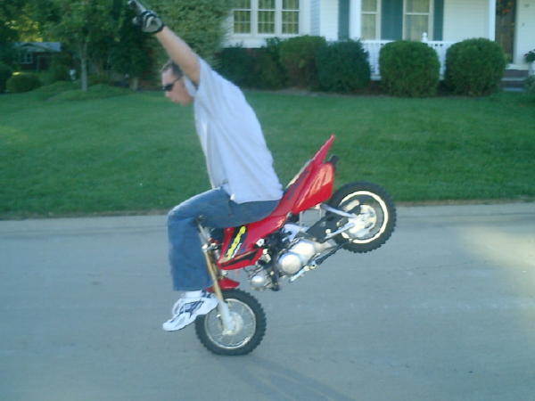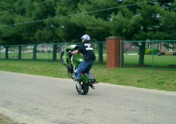 I'm gettin better and better at roll on stoppies, i'd say around 50ft. but i can't see how people go further than that, since a stock fiddy only goes like 34 mph or something?? i dunno , but its all good, live and learn. Here is a picture of my boy Brian, this is his first year riding/stuntin fiddy's. I've got him into seein how far we can drag bars, this is him draggin about 15 ft or so..pretty smooth for an amatuer, hahahaha rookie!