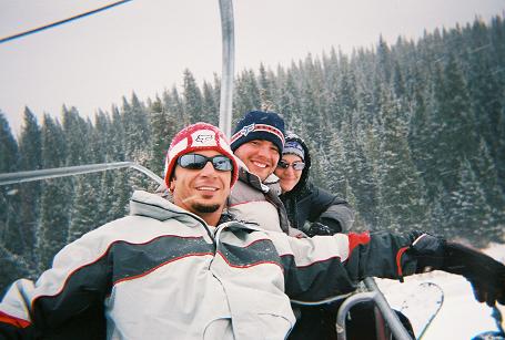 Last weekend, Patrick Stevens (www.patrickstevensfreestyle.com) and Skinbabe came up to the mountains to learn to snowboard. Guess who got to teach em?! That's right.... little ol' me. It was a blast. Patrick picked it up within half a day and Erin managed to get down the hill without falling after a couple runs. Here we are riding the lift up....