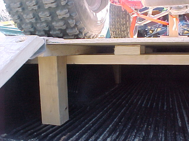 I put a removable 4x4 in front of the rear window so that I don't drive right through it. I also used 4x4's for the feet of the platform and 2x8's on top of those. There's some 2x4's running across the width of the bed for added strength. Driving onto it seemed weird at first, but it's very easy to load and unload. The quad doesn't move around at all. I have plans to paint the platform black so it doesn't look like such an eye sore.