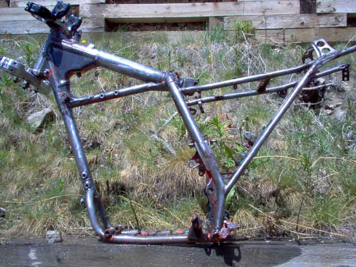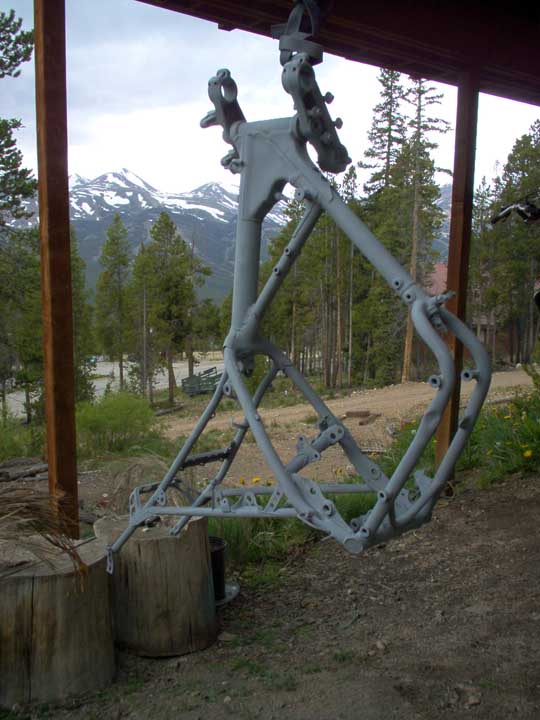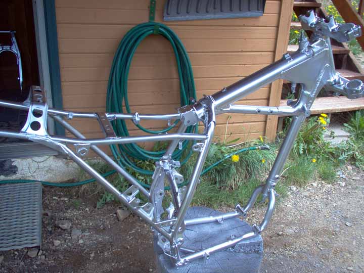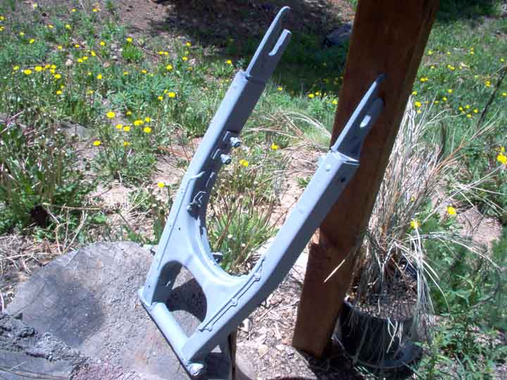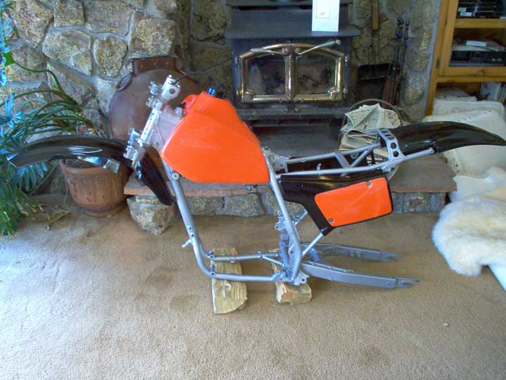Alright.... here's what I've got done so far. The frame has been stripped, primed, and painted. I used a gloss grey that looked chrome untill I added the clear coat. Once the clear coat was applied.... it looks very simular to the grey Honda uses on the EX frames.