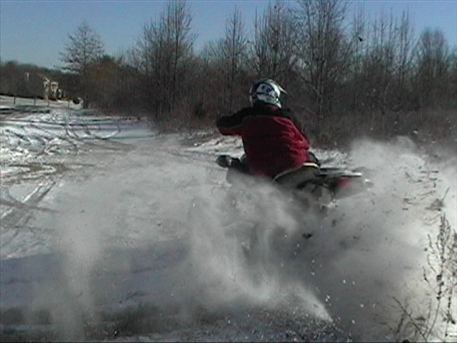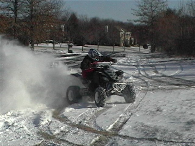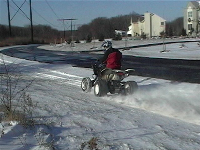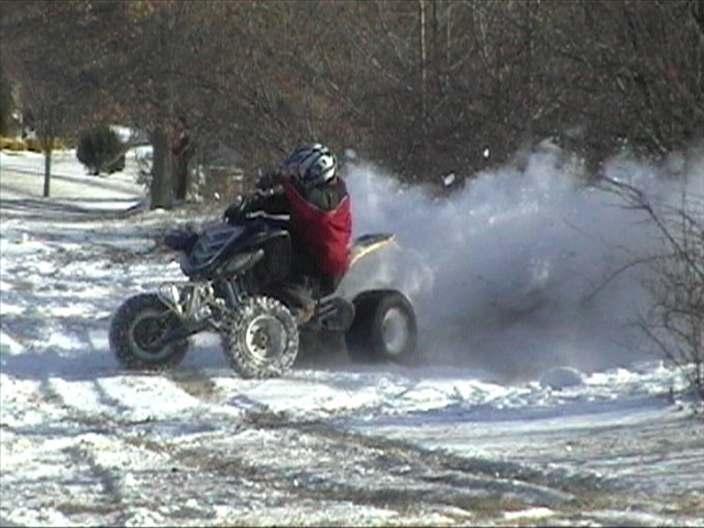 Quads are more fun in the white stuff especially when you hook a sled up to the grab bar and go off tabletops with people on the sled. I took my bike out and busted my *** so many times sliding out in the ice. I never fell so many times in one day. Here some pics of my friend powersliding his raptor