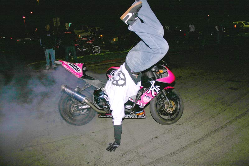 Britton, E-Dub, Kane and the 14yo AC Farias were all ripping it up and Keith nudges me while Kane is doing a rolling burnout and says "check this out". The freak gets off the side of the bike mid burnout and does a static burnout handstand!!