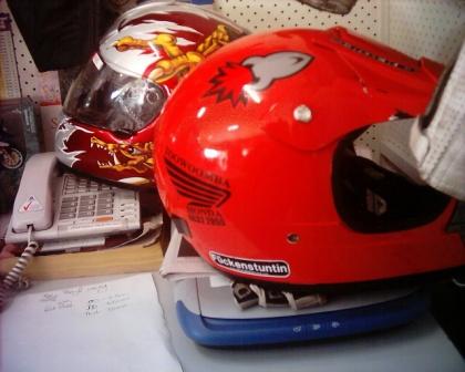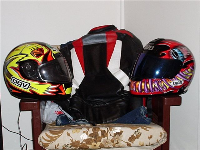 Shoie Duhammell on the road and an old dirt lid when im out stunting, Dirt lid is painted the same as my bike and has allready saved my Shoei (and my head i guess)more than once...