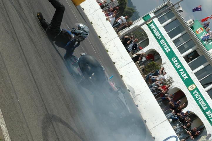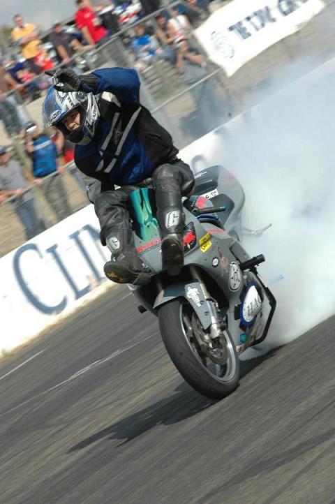 And I wander into a newsagent to have a look at the bike magazines (as you do), when all of a sudden one particular glossy American magazine grabs my attention with a line on the front cover something like: “Stunting Down Under “ (can’t remember exactly what it was, remember I’m half asleep) anyway I flick through a bit and see a bike, mmmmmm not too strange I suppose, except that I recognize this bike, (a grey R1 going sideways) and I recognize the event, it was the stunt comp at Oran Park.
