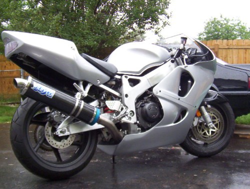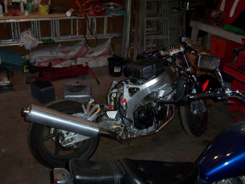 I'm almost done, I just need a few more parts. The hardest thing about putting this bike back together was waiting on the parts. It took about a month to get the subframe. The sharkskinz body fits nice. I painted the bike with DuPont chroma base and used dupont nasson clear. I replaced the stock exhaust with one from Wileyco. It sounds nice and looks good.