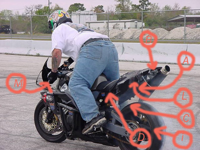 E. Broke the passenger right side peg off dropping the bike after a burn out in Wisconsin.
