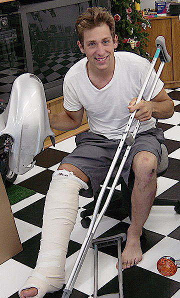 He just got hiz 3rd cast removed and found out that the bone is not progressing. He now has an walking cast on with a bone stimulator (to maximize circulation to that area) which he will most likely have for the next 6 months. As you can see in the X-Ray's he has a metal plate on the anterior side of hiz ankle where he broke it in 2 places. You can see where the tibula broke and how it is not healing. He has 13 screws and a titanium rod throughout the tibula. Price you pay for being a Stunter!