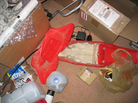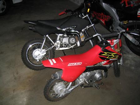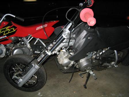 1) Xr50= xr70 engine, big carb kit w/ intake, xr70 forks w/ gearworks springs, xr70 shock w/ gear works springs, xr70 swing arm, tall seat foam, aftermarket grippy seat cover ( its black and i cant remember the name of the company), black bars, red grips, carbon fiber skid plate, xr70 pegs and shifter and rear brake pedal, black front rim with HD spokes, street tires, the rear rim isnt hooked up yet, u need to weld a little tab for it. SHouldnt be hard at all. Painted black plastics. Theres probably more stuff but i cant remember it right now. 1400?