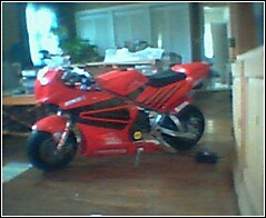 stevie and i were messing with it tonight but it doesnt seem to be running right. i gotta call the place tomorrow.its pretty sweet though, its got electric start, a horn as loud as our bikes, and hook ups for a head light, and turn signals.they say its supposed to do about 40 but on my speedometer it barely breaks 30.something isnt right with the thing also its alot bigger than a pocket bike it sits just as high as stevies fiddy. its like a cross between a pocket bike and a ysr lol