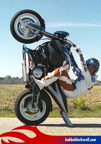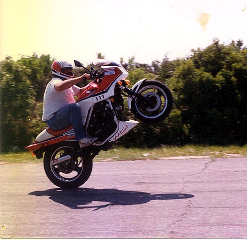 But before that, I was at BikeWeek 2000 during the Rice Paddy, and one of the Wheelie Boyz(the short blonde guy with the silver half helmet) was practicing outside the barrers and he pulled the front end straight up(with the clutch) sitting down held a 12 o'clock wheelie at about 2 miles an hour. I almost died right there, that was SO kick ***!!!