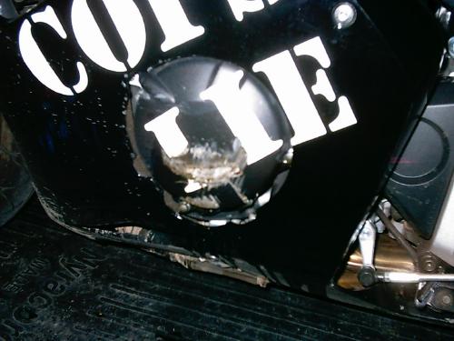 Went to fla for bike week, stayed in orlando. One night we rode west to avoid the rain in daytona and ended up in some area with lots of factorys and a nice quiet street. Well everyone says try 12's with out a bar, so i start tryin them standing at first and am getting real close to scrape. I decided to try one sitting, I pull it up at 7 mph and cover the brake. It came up, then scraped the tail, then scraped the pipe. The pipe sent me sideways, the bike came down on the left side breaking the side case. I fell off, rolled a little, looked up and saw a huge puddle of oil. I lost a day of riding due to parts not being available. What sucks is i have a bar but i decided to leave it off until i could get it close enuff without it. Now the bar is going on, going to shorten my can, and fab a cage.
