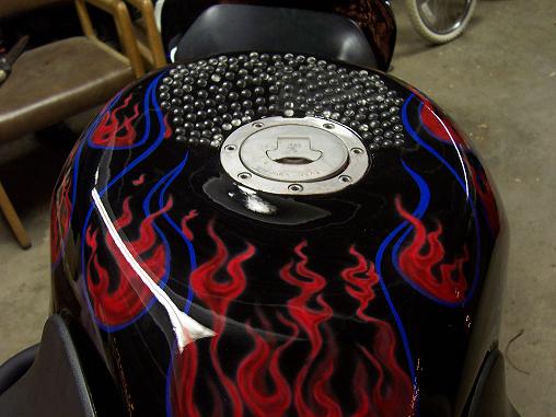 oh yeah heres my tank with my old paint job. It's not too deep and it has been bondo'd a little bit to smoothe out the edges. I wanted to save some fuel space cuz it was my only transportation for a while