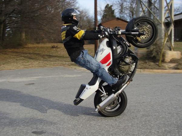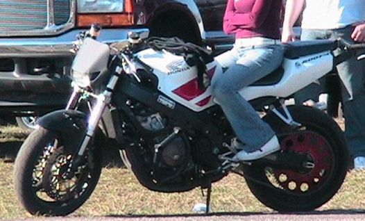 Blue 2001 Honda CBR 600 F4i streetfighter with 954RR front end. Also had Vortex clip-ons, 60-tooth rear sprocket, 12-bar, brand new cage, hand brake. The sprocket and wheels had stickers on them that said "Custom Cycles", cut stock exhaust.