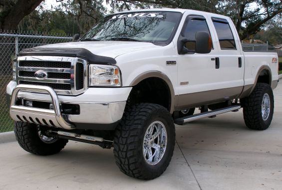 I got a F350 crew cab long bed 4x2 with a 6 inch lift on 20's w/ 35s (nitto mud grapplers). Getting roughly 14-15 mpg. completely stock. got about 51k miles on it right now.