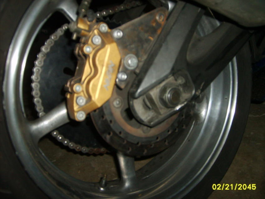 I have looked into getting a larger rotor on the rear. The pad dose not make full contact on the rotor there is not enough room. mine is clocked a little so it clears the wheel hub. It was not difficult to make a bracket to hold the 4 piston on my r6.