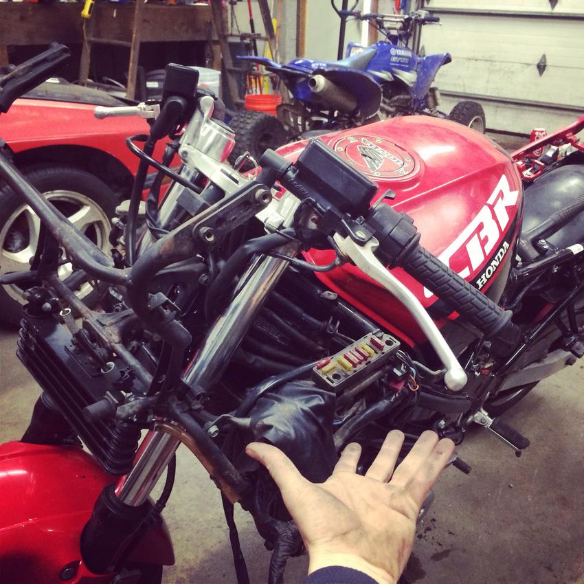 Life happened. Became street-less. Fast forward to now. Came across a 91 cbr1000f that ran well for a few hundred bucks. Good enough to get me riding. Disappointment due to weight for stunting. Obviously it had been wrecked like every bike I've ever owned. Since it's a rare bike and finding parts for it sucks, this one is going street fighter.