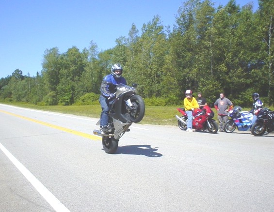 Tuesday night, which is the local night for Hooters, me and a few friends of mine are heading out. 3 gsx-r 600s and 3 r6's. Well after traveling for a few minutes and getting warmed up i decide to pull a stand-up in front of everybody....had to show off. While in the process of my wheelie a state trooper apparrently crossed the road right in front of me, as i was told by a fellow rider, all i remember seeing was a dark car. Well i continued my wheelie for a good 1/4 mile at about 70-75 and decided to bring it down because trafic was kinda thick ahead, so i did and then looked back in the rearview's to see where evryone else was. When i did this i noticed a "new" set of headlights riding with us. well these headlights belonged to a sheriff's car, and before i knew it the blue lights were on. Unfortunatley he was already too close and coming on too quickly for me to try and bail, so i did my best trying to be a good citizen and pulled over. the cop comes up to me and says "license, registration, and endorsement". License and registration, no prob...endorsement, nada. after hearing that, the officer walks back to his car, gets his ticket pad and walks back to be and says, get this "i could write you a ticket for the wheelie, which was really good by the way, i liked it, but im not going too, instead, im going to give you a ticket for not having an endorsement"(apparently you can be taken to jail for that). well after searching for a minute the cop comes back over to me and says, "son, it's your lucky day, i dont seem to have a black ink pen, and being that i dont have a black ink pen, i can't write you a ticket". And so with speeding, wreckless driving, and no endorsment he still let me off the hook! we could use a few more cops like that....lol