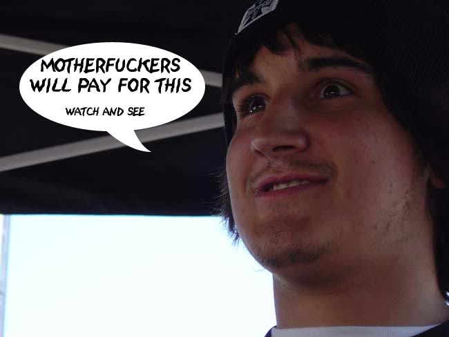 I am pissed off still. 3 days after the fact. I risked life and limb to execute a ground breaking stunt to get beat by a bar trick the crowd judged. BAR TRICKS ARE NOT HARD YOU *******!!! and to prove it I'll inform you that kid can't even get a manual car into reverse (i had to pull merk's impala out of the driveway for him) bwahahaha