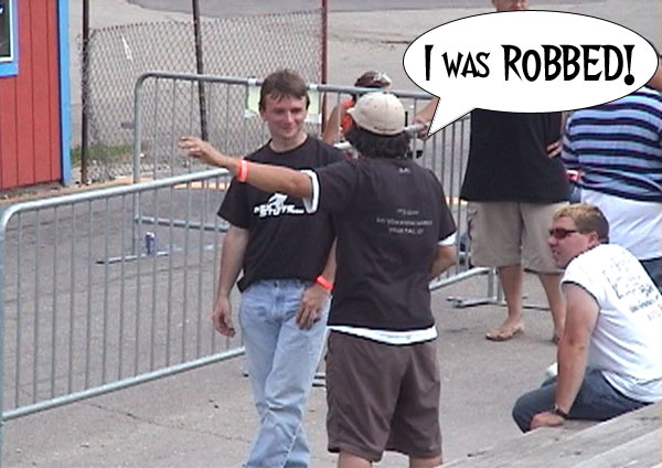 I feel your pain bro. We had a local competition a few months back and it was judged by the crowd. We started w/ 20 people and eliminated down to 4. I was the 1st person to go for each round. not to toot my own horn but I was killin it. so the final round is over and it's me and 3 other guys. I went 1st and nailed every trick clean as hell. The other guys (all my friends as well) missed alot of tricks and crashed a bunch. When the croud decided everyone else did better than me the other 4 guys looked at them like they were fools and tried to give me their prizes. I sucked it up and said, "Nope, they were the judges and no matter what you think you pleased them more than I did so that's how it works."