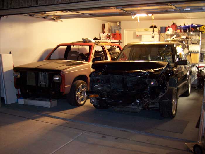 put old toy and new toy in garage...