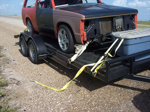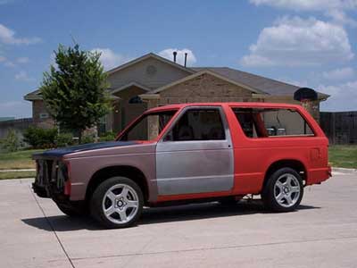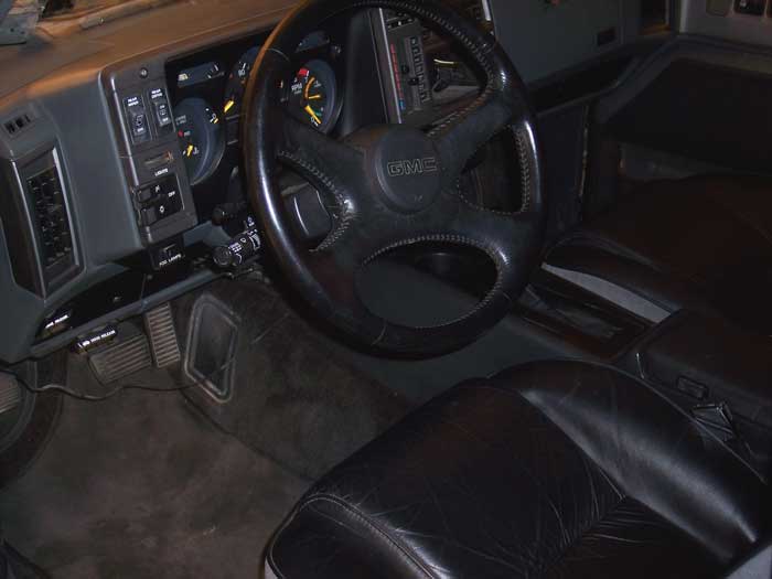 LT1, 4L60-E, SS heads & intake, ported, CC502, MSD blaster coil, 2000 stall, All Wheel Drive, etc, 2" cowl hood, shaved handles tailgate and roof rack, LS1 brakes, C5 wheels, 91-93 GMC grille, weld on Grants rollpan, bell tech lowering keys and 3" lowered leaf springs, remote door poppers, complete 92 Typhoon interior, etc