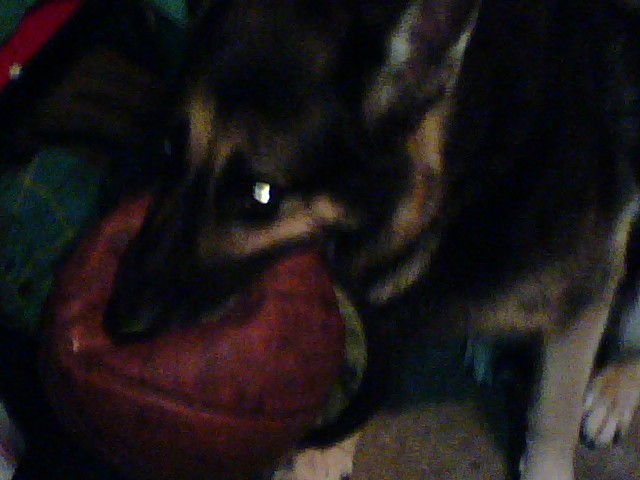 i went out to smoke a cigarette and snapped a pic of boogs with his two favorite toys , it's dark out so the pics are dark but you can see his floppy frizbee and his basket ball