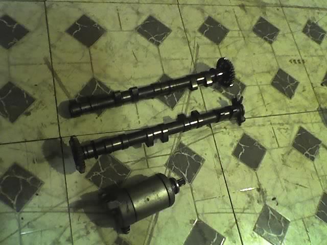 see those two shafts? they go inside the motor. they turn, and the cams (the tear drop shaped parts along the shaft) push down on the valves as they're turning. some valves allow fuel to go into the cylinder and others allow exhaust to escape the cylinder.