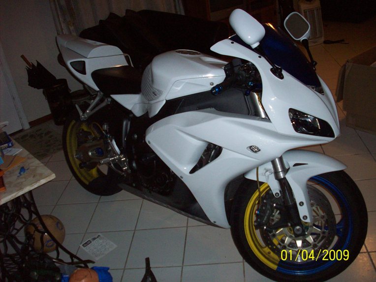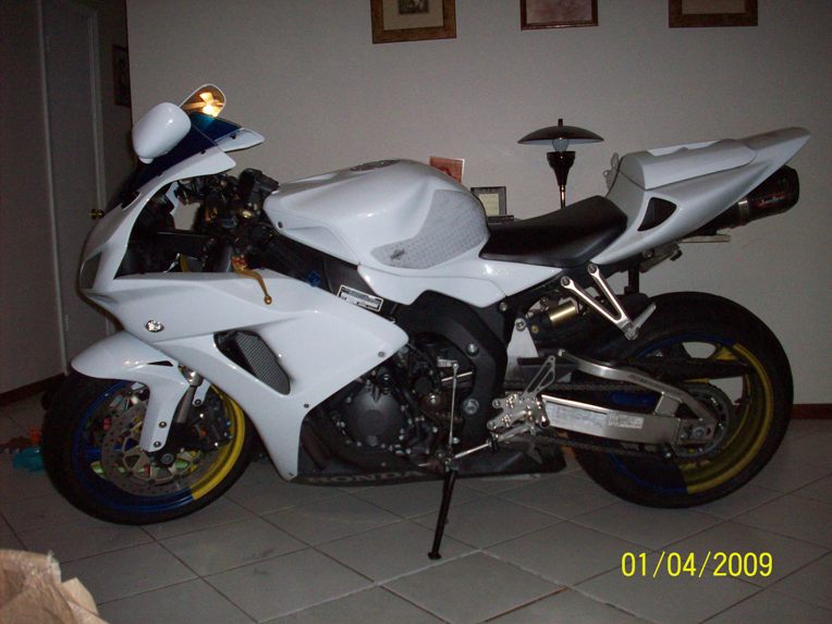 got some pearl white fairings for my 1000RR, OEM. don't know what i'ma do about the rims. might just leave them as they are. i like it though. i'm keeping the blue and lellow fairings. prolly gonna get blue OEM decals for the white though.
