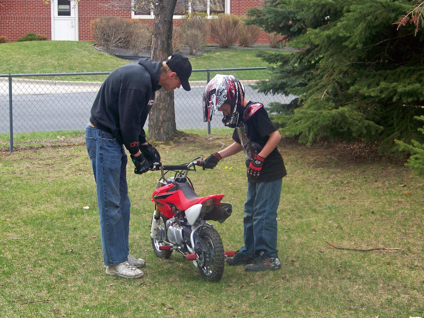 I got my 9 year old on the fiddy for the first time today......He crashed threw the fence on his 4th trip across the yard but other than that he did good... I turned the throttle stop all the way in so the bike would only move at a jogging pace... I still managed to get a few wheelies out of it....lol