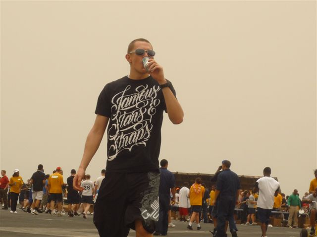 My roommate has an obsession with Famous Stars and Straps. As you can tell from the pic of him deployed to the Middle East. Oh, his name is Famous too. hahaha