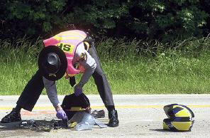 The motorcycle came to rest on its right side under the truck, and MacQueen's body, in a yellow motorcycle jacket, came to rest beyond the truck.