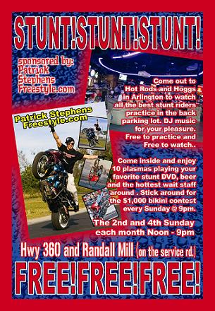 Hot Rods and Hogs this sunday nov. 13th stunt riders from all over will be practicing from 2pm - 9 pm in arlington ... then stick around for the $1,000 bikini contest inside ...