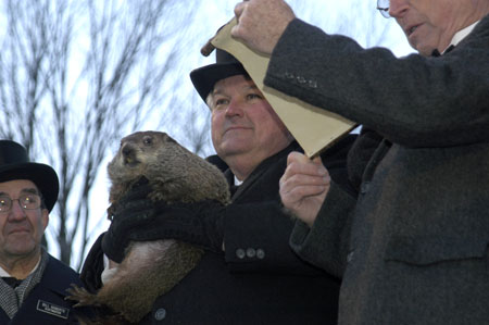 On this Groundhog Day, February 2nd, the year 2005 on Gobbler's ****, Punxsutawney, Pennsylvania, Punxsutawney Phil, King of the Groundhogs, Father of all Marmota, Seer of Seers, Prognosticator of Prognosticators has been summoned by Groundhog President William Cooper. Phil gleefully exited his burrow at 7:31 a.m. to be greeted by his longtime friend and handler, Bill Deeley, who held him high so he could greet the large throng of Faithful Followers. He wished them all a "Happy Groundhog Day." Bill placed him atop the old oak stump where he surveyed his surroundings. He then turned to President William and in Groundhogese directed him to the scroll which reads: