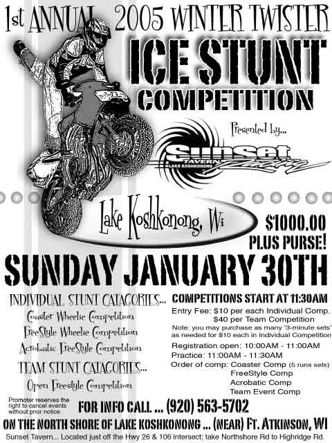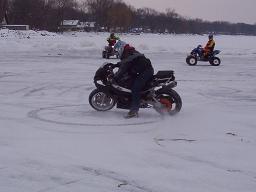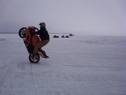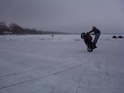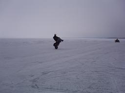 ...Lake Koshkonong is a 10,000 acre public domain parking lot. All we have to do is plow the snow off! PULIC LAKE= NO Cops, NO Tickets, NO Hassle!!! I'm going right now to get my other Heavy Duty plow truck fixed. Should have a Wide-High-Speed strip plowed sometime this week. Also checking into the power broom today also. Watched the VMC & D-Aces guys test/practice right out the bar windows yesterday... incredible stunts on ice! ...I mean INCREDIBLE! It drew spectators big-time. By-standers all had WAT-DA-FOC smiles on their faces! There is definetly a new level of stunt riding being born!!!!