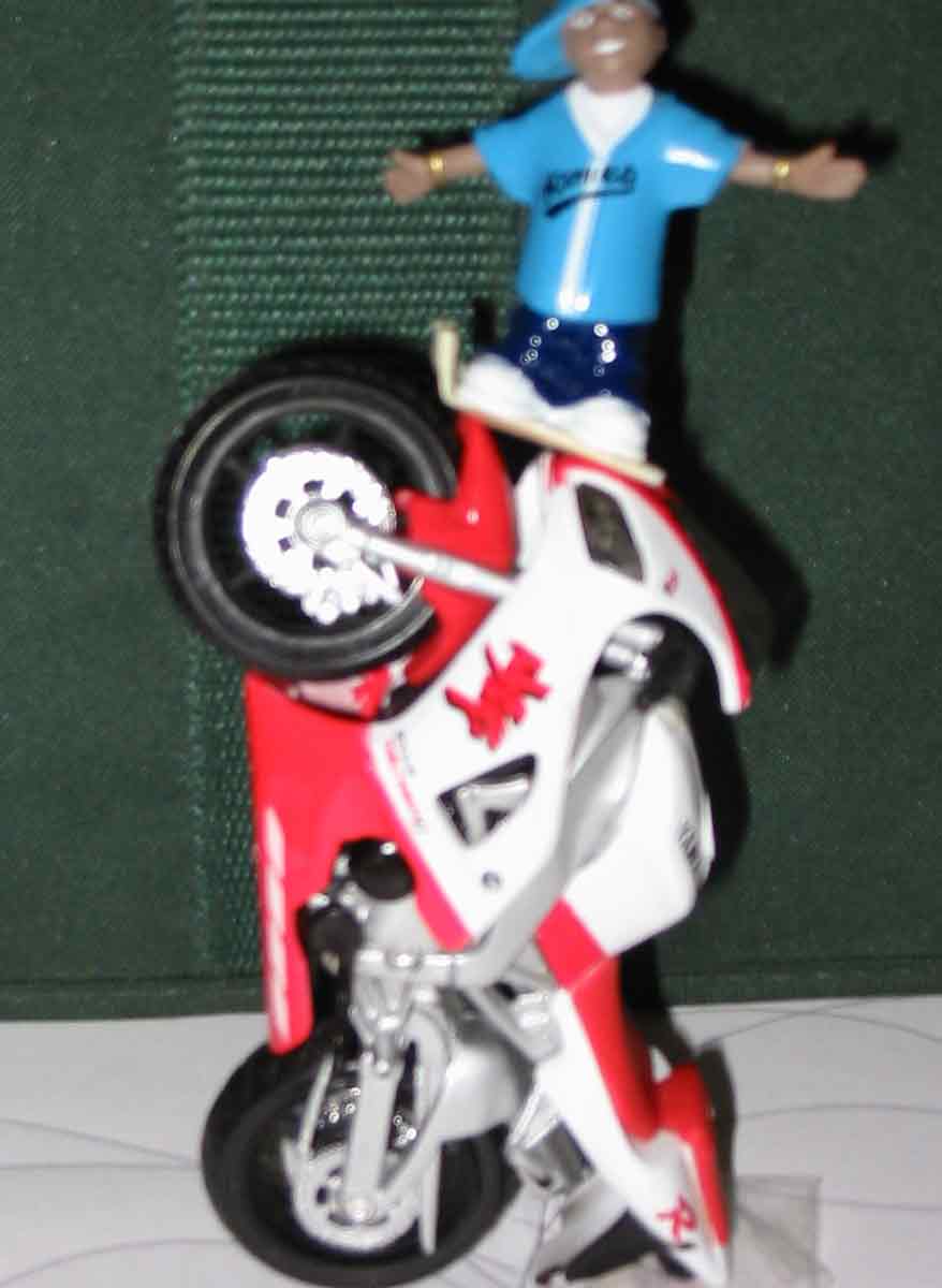 I've got tons of those 1/18 scale models made by maisto. I found them all at Wal-Mart & Target, and I got that same Ben Bostrom toy from Target for $10. You can take the entire bike apart, it's pretty f'n sweet. The 1/18 models are $2 apiece. I need to borrow a friend's digital camera...I bet my Ben Bostrom could STUNN the **** outta your Ben Bostrom!!