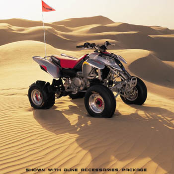 If you don't know much about these, heres a little background. They are race-prepped from the factory. Fox Gold shocks front and rear, s.s. brake lines, positive antidive, wave rotors front/rear, boxed swing arm, Douglas Alum rims with Beadlocks, Maxxis Razors...its a 500cc 4 stroke with alum chassis. Super light, very fast!