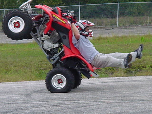 start out by laying on your quad with your back against the cushion, so pretty much your looking at the sky , start it going, wheelie to 12 and perform a backwards cliffhanger/apehanger