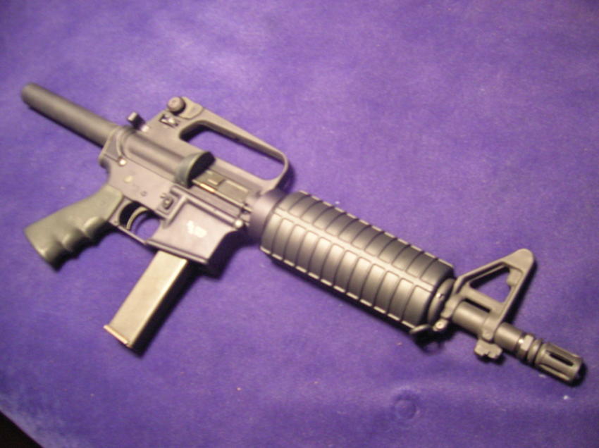 Not really 100% finished with it yet but real close. Its a RRA 9mm marked pistol. Originally is was a 10-1/2 barrel A2 top (in pic) but I did a A3 flat top and had the barrel cut down to 4-1/2 inchs and covered it with a Olympic free float rail. Also have the Magpul Miad grip, Spike's Tacical dedicated 9mm billet buffer, tactical charging latch and Ace tube cover. Left some room up front for my YHM suppressor when ever my form 4 clears