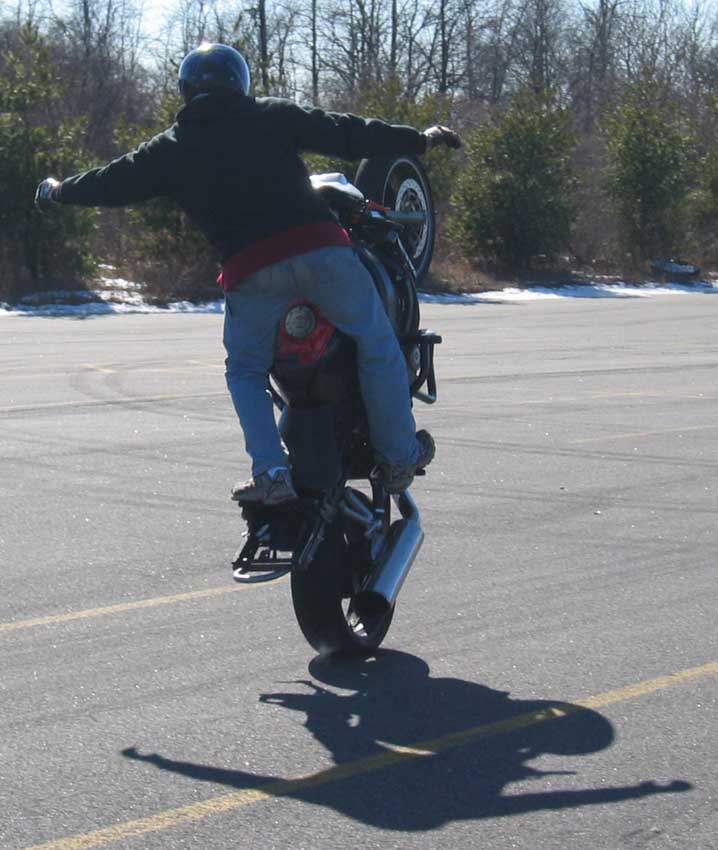 as for sit down no handers... the higher you put the idle, the faster youre gonna go and the more stable the bike is gonna be.... just start by puttin it at like 5 grand... once it hits the balance point, take your hands off.... oce you get the hang of the balance point and usin the rear brake, then start lowerin your idle... when i do shows, i do them at 4 grand (f4i, stock front 16 up in the back)... when im goin for distance, i crank it up to like 6500....oph yea, both in first gear