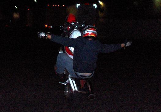 and do sit down no handers the correct way.. both feet on the pegs!