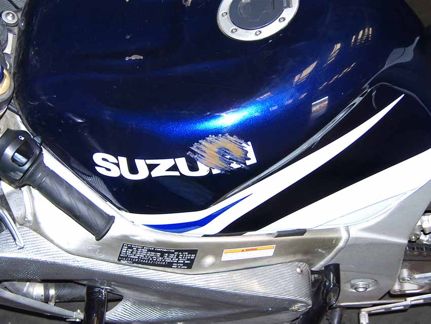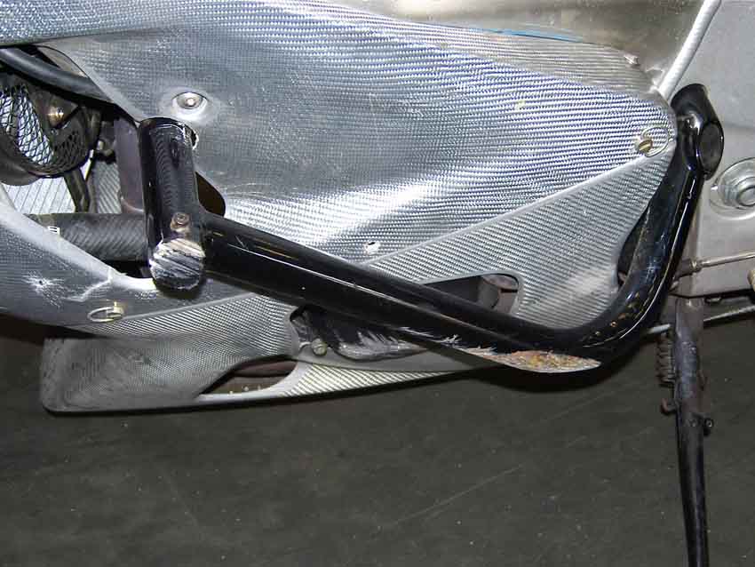 and the pics. theres some damage to the exhaust, he went up a curb. then some small scratches on the rear. check out the grooves in the tank & sliders. the damage on the cases was from the first time he dropped the bike, which is also why it has the titanium carbon fibre uppers & lowers before he had the cage